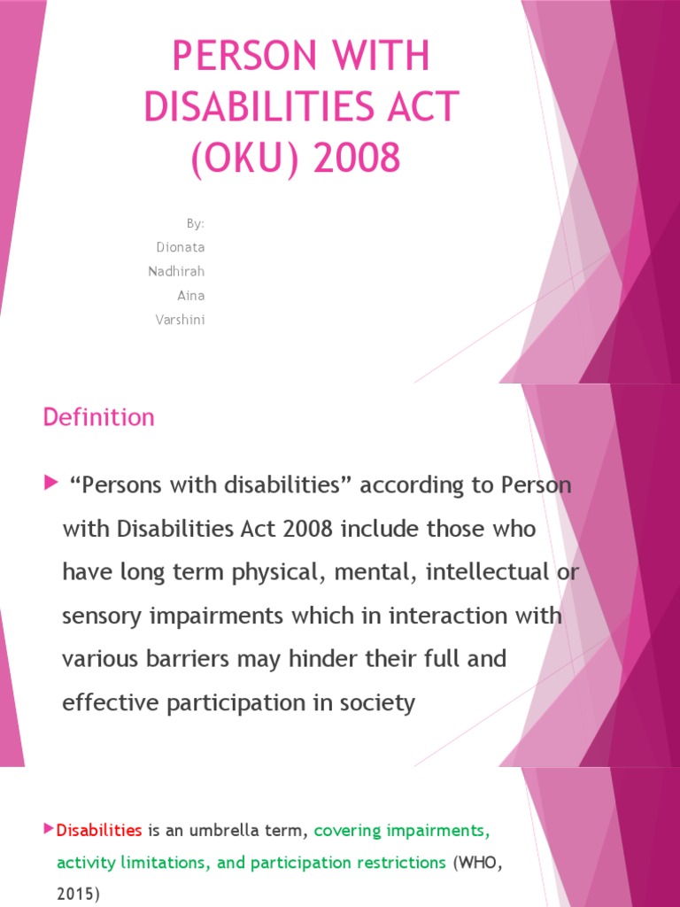 Persons With Disabilities Act 2008 : Frequently asked questions about section 504 and the.. What is the purpose of the new ada amendments act of 2008 (adaaa)? It has been over 6 years since the malaysian persons with disabilities act (pwda 2008) was enacted. Start studying americans with disabilities act. Special education due process meeting and the resolution meeting. The law was intended to clarify the scope of the definition of disability under congress passed the ada amendments act (adaaa) in response to several supreme court decisions that had narrowly interpreted the americans with.